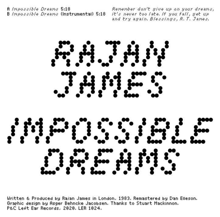 Rajan James is a Jamaican-born English-raised musician and her Impossible Dreams have been preserved by Left Ear Records. Thankfully, both the unreleased full-length versions, including the instrumental, appear on a loud 12” single – the vocal is unique and memorable, so that instrumental will also give longevity to this and more versatility for DJs, it being such a quirky sax led boogie number with nods to UK 80s synth-pop.